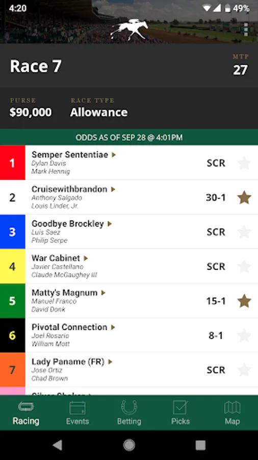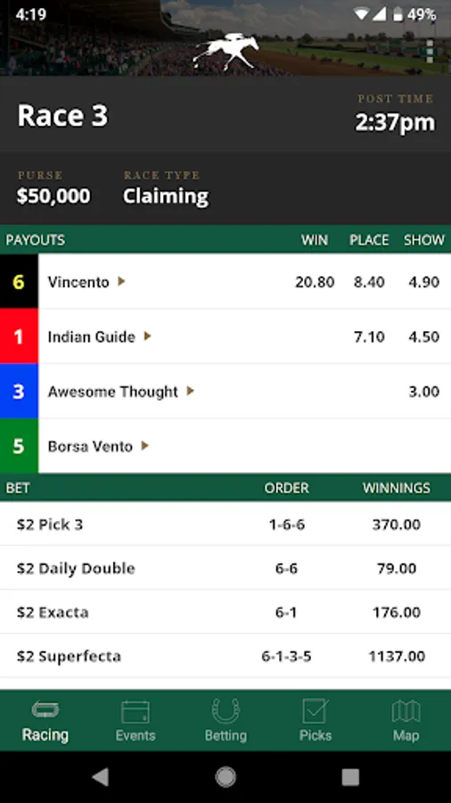 Select your favorite horses in upcoming races and save them for future bets (just like circling horses’ names in the program) and view race results.