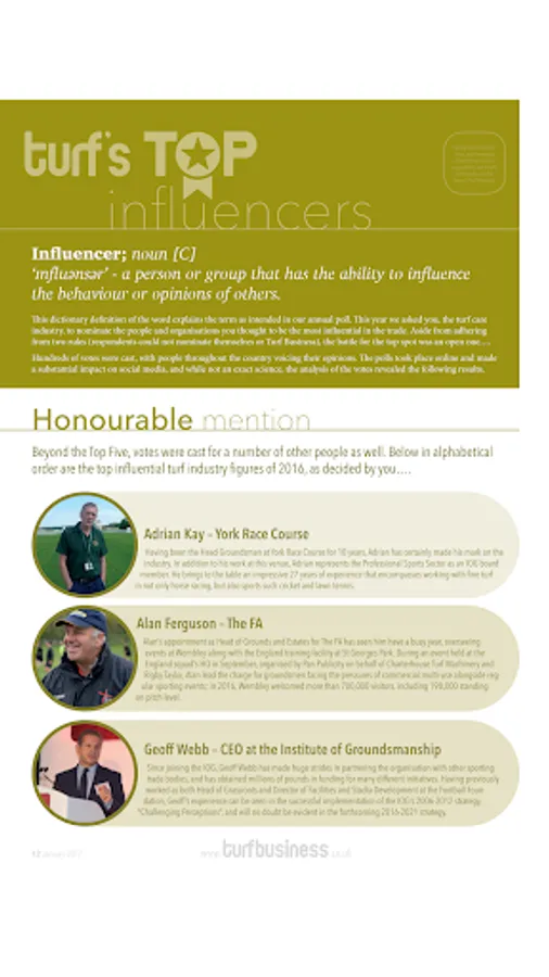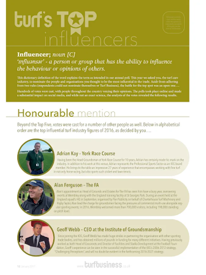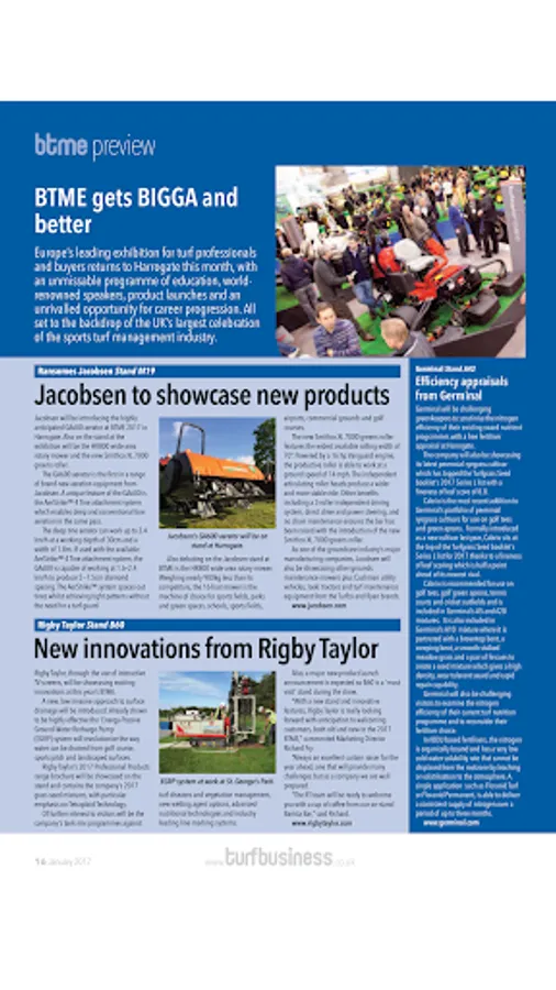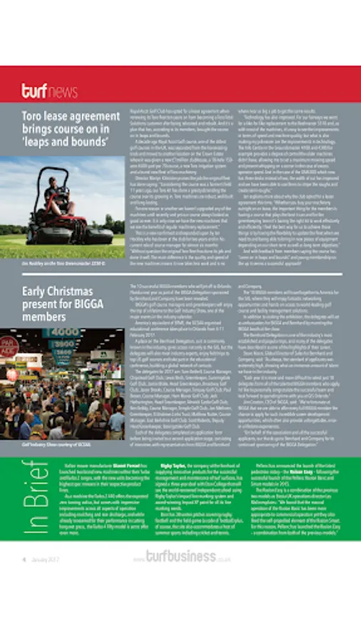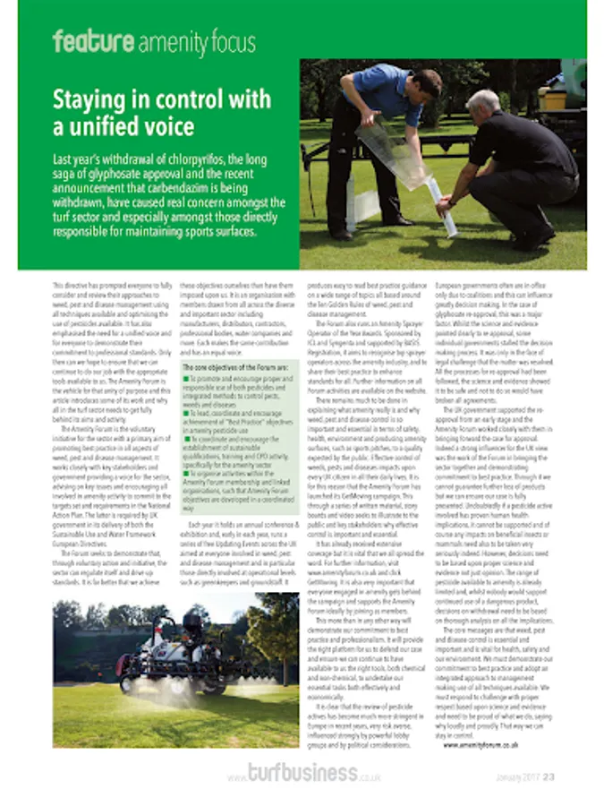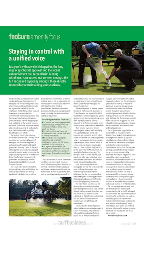 Turf Business – the monthly magazine for everyone whose business is turf – is available as a printed magazine, in digital format and now as an App on the Android platform, covering sports including golf, football, rugby, cricket, hockey, tennis, bowls and horse racing, as well as the leisure, amenity and local government sectors. Turf Business publishes a mixture of industry news and features in a concise and professional format aimed directly at turf care professionals to help bring a broader understanding of the problems facing and the solutions available the industry.
