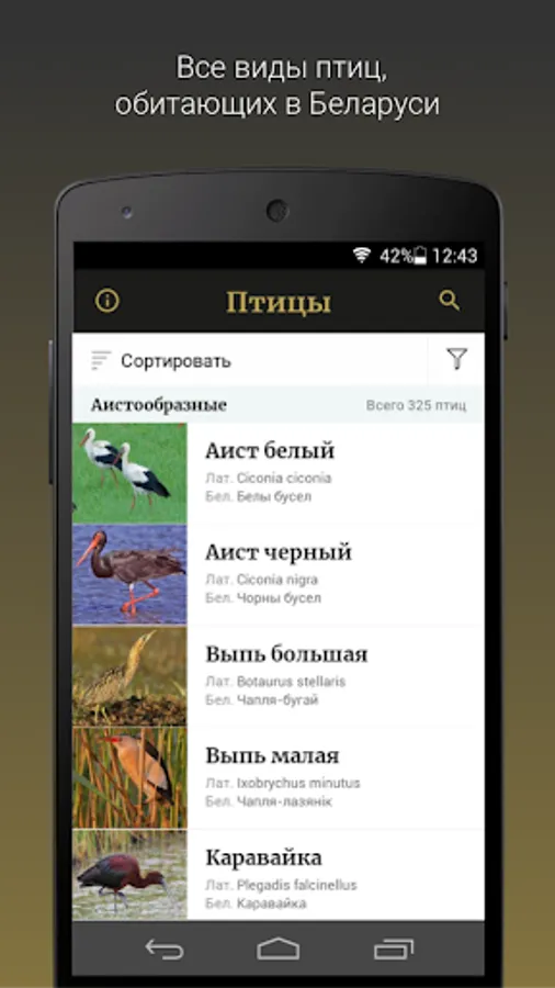 The Ptushki identifier contains filters by size, feather color, place and season of a bird meeting, beak shape, behavior, leg color, family and squad, as well as photos, descriptions, distinctive features and voices of more than 300 species of birds in Belarus.