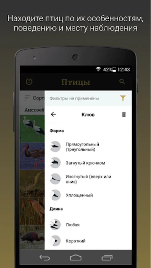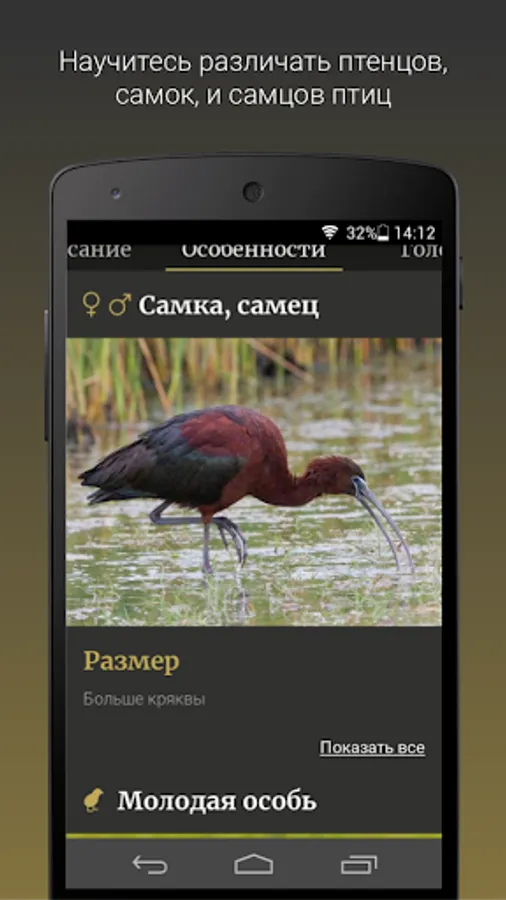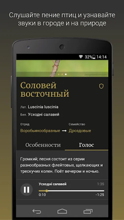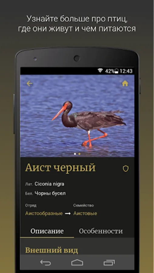 With the help of the application you will be able to identify the bird, as well as learn the features of its nesting, feeding and distribution.
