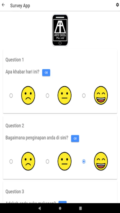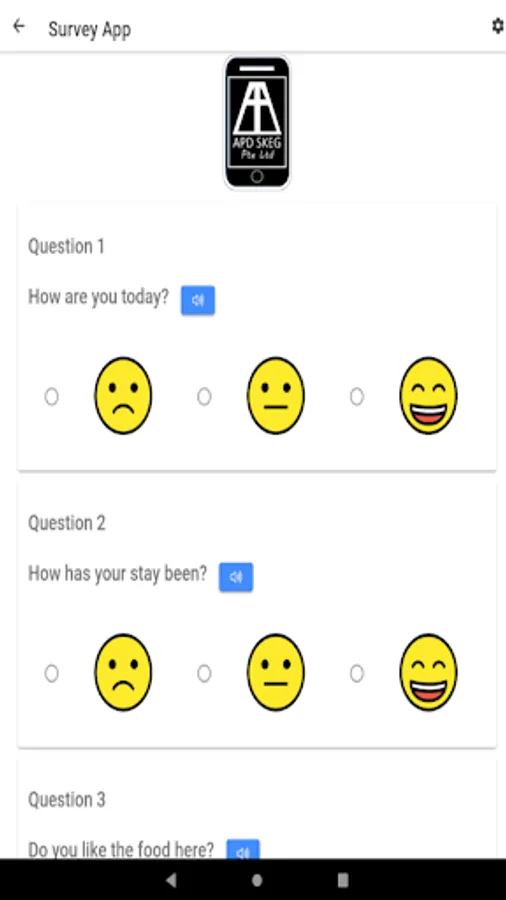 APD ClinVey lite allows the building of multi-lingual voice surveys that allow answering through happy faces. This allows fast and quick responses on survey questions without much reading and allowing fast feedback.