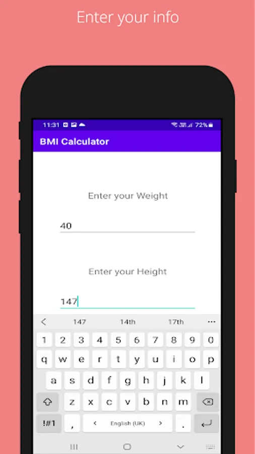 This app is cool for calculate BMI. This is created by Anuraj Suhash (the author).