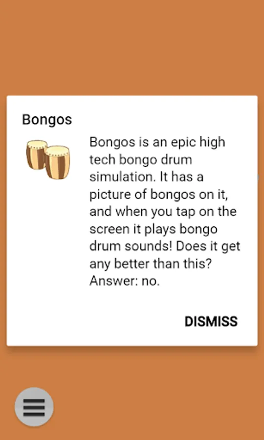 If you have ever had dreams of sitting on the sand all day playing the bongos, your dream is about to become a reality. Bongos is an epic free high tech bongo drum simulation. It has a picture of bongos on it, and when you tap on the screen it plays bongo drum sounds! Does it get any better than this? Answer: no.
