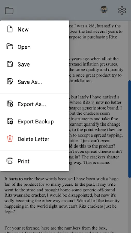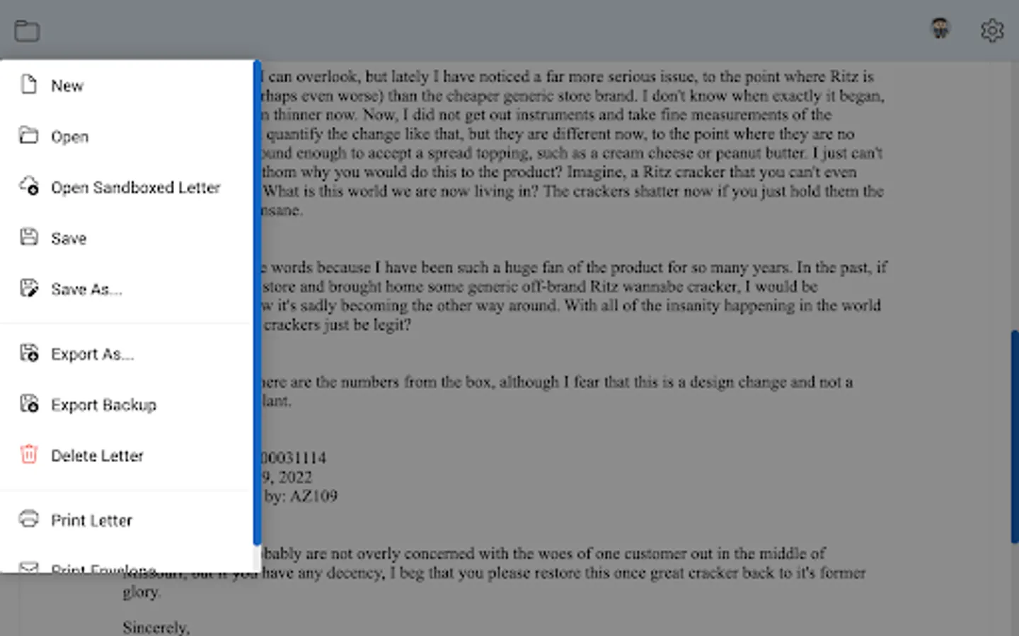 With EZ Letter Maker, you can print your finished projects from within the app, or export your files in multiple formats, including PDF, plain text, or Microsoft Word document (.doc) format.