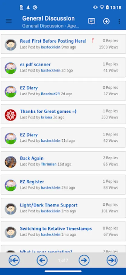 Forum theme customization: Forum Fiend allows users to customize the theme color of the app on a per-forum basis. Give each forum you subscribe to its own look and feel! Forum owners can also provide default theme settings for their forums by saving a small .json file to their forum server. See https://www.ape-apps.com/viewpage.php?p=forum-fiend for more information.