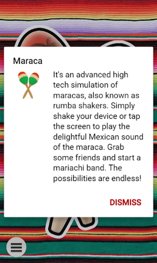 Maraca is an advanced high tech simulation of maracas, also known as rumba shakers. Simply shake your device or tap the screen to play the delightful Mexican sound of the maraca. Grab some friends and start a mariachi band. The possibilities are endless!