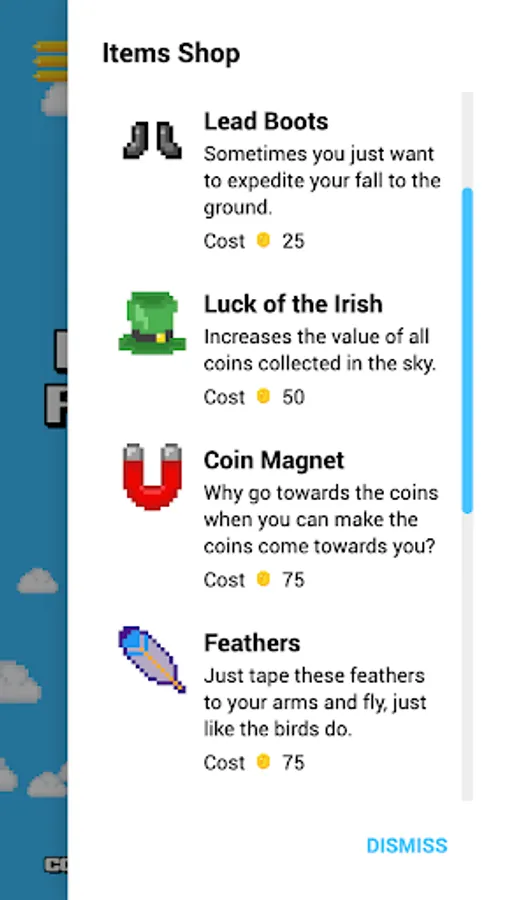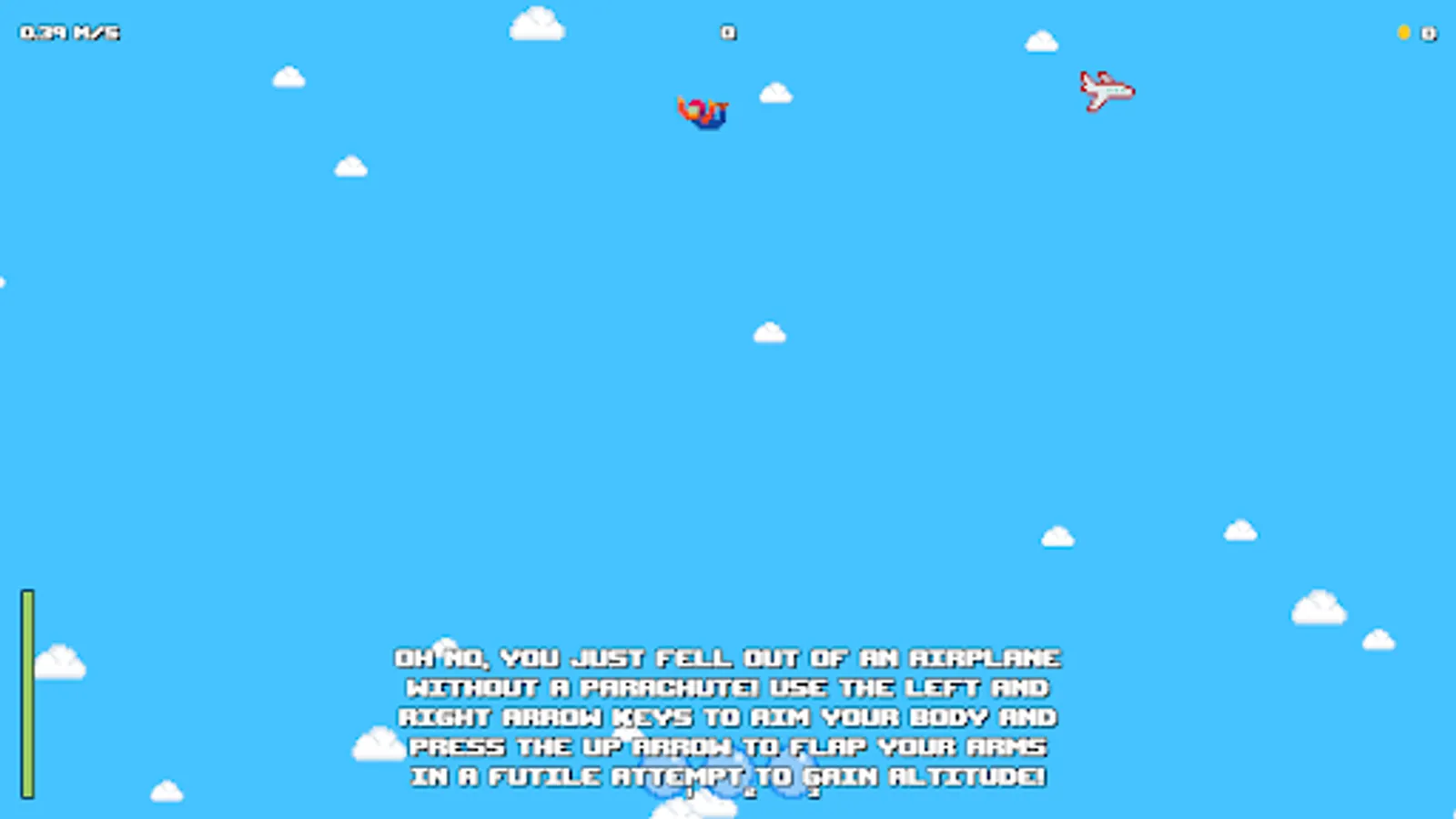 In Without a Parachute, you must flap your "wings" (arms) as fast as you can to try to delay the inevitable. Along the way you can collect coins that will help you buy amazing powerups that will further increase your chances for fame and glory in the skies. Oddly, the item shop does not sell an actual parachute...