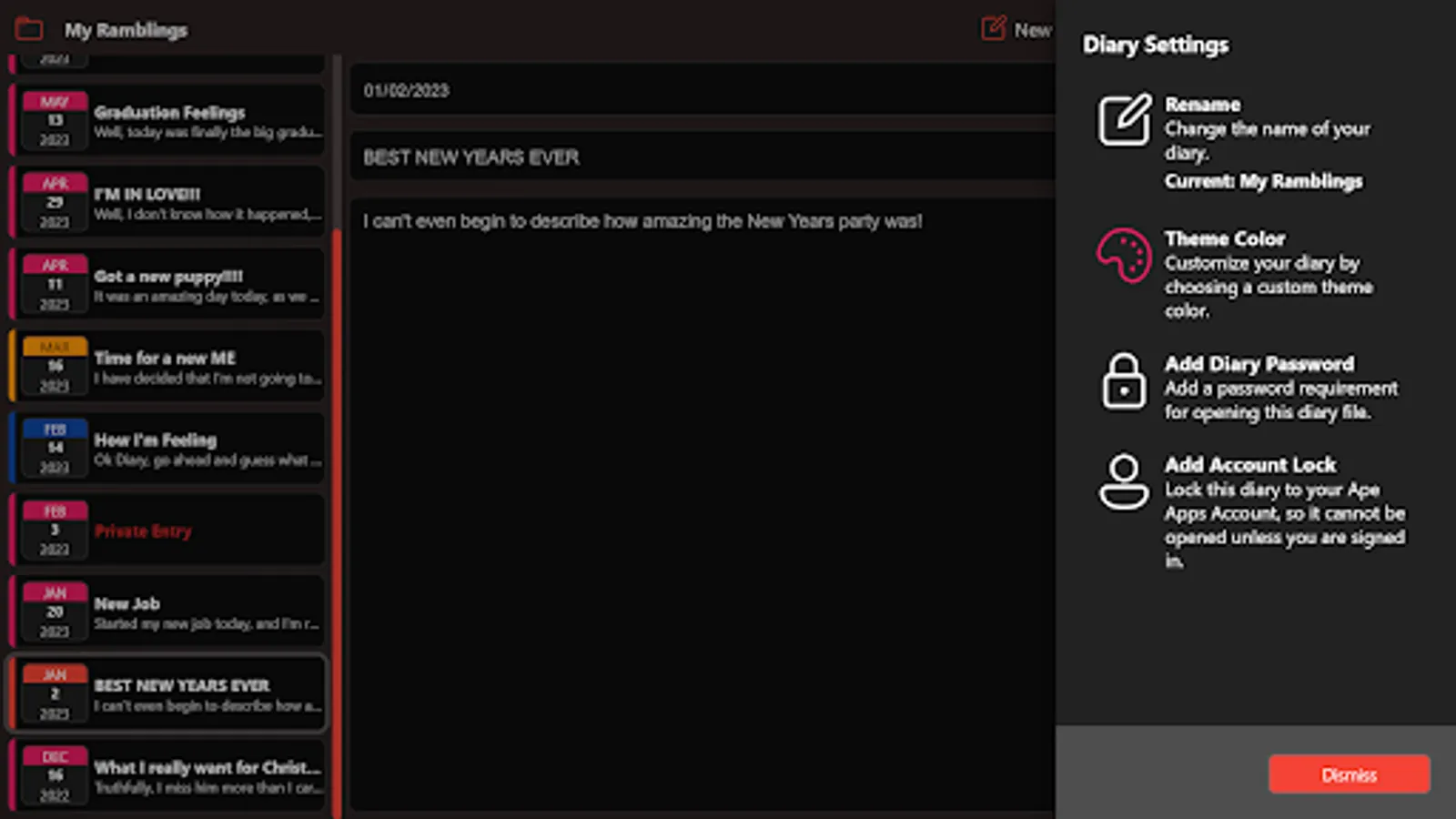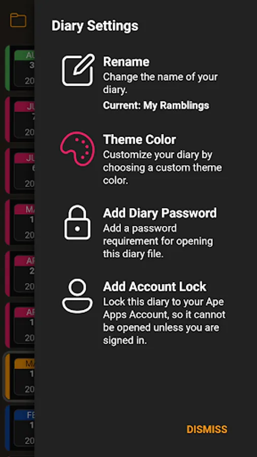 EZ Diary allows you to create multiple diaries, with unlimited entries in each. Add password protection at both the diary and journal level, customize your theme colors, and (optionally) sync your diary across your devices by signing in with an Ape Apps Account. EZ Diary even allows you to print out your diary to paper for permanent storage. Keep track of your memories, feelings, daily events, appointments, and even your secrets.