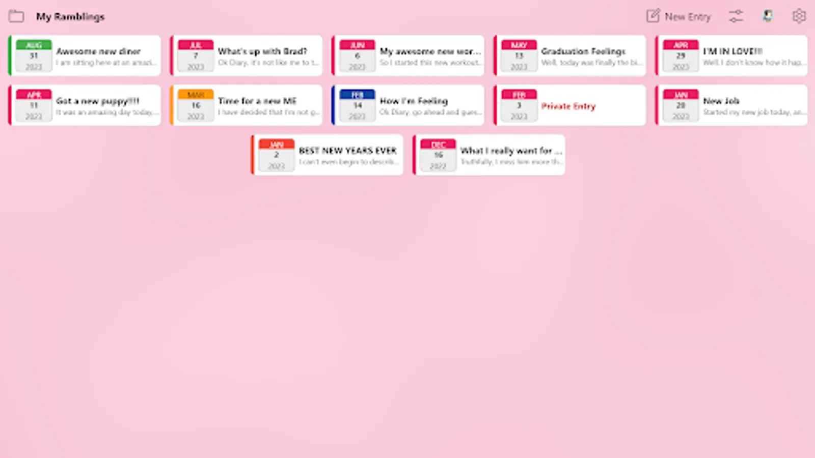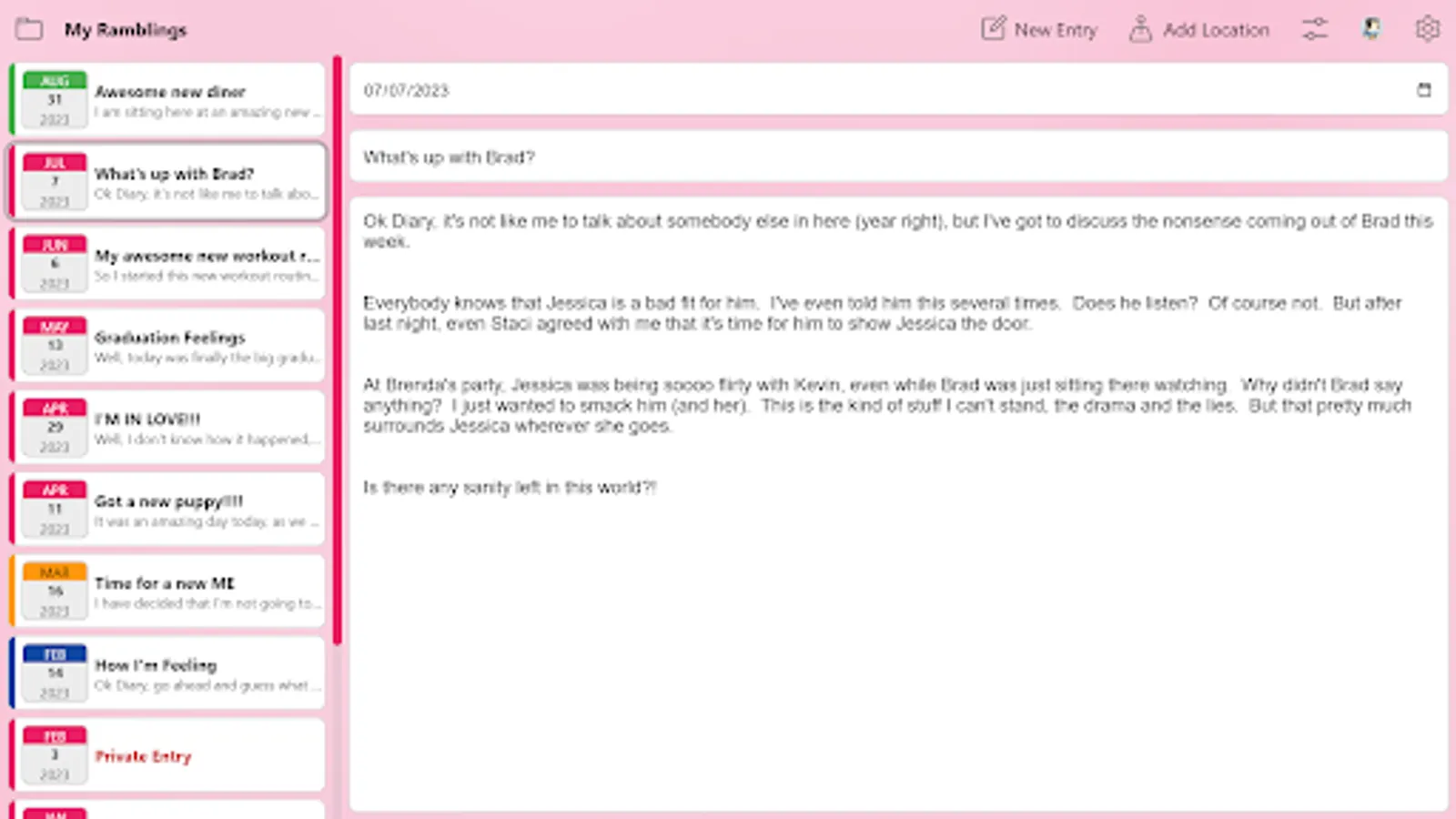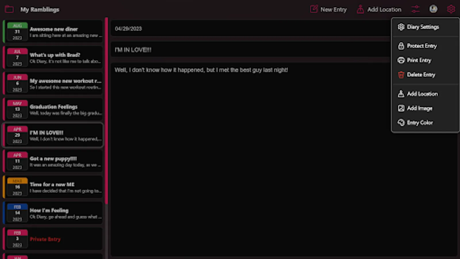 EZ Diary features lets you color code your entries, tag your diary posts with location data (which contains current weather for future reference), password protect your entire diary or individual entries, and more. Our diary app is built to be powerful yet easy to use for people of all ages, with the ability to keep your notes private and secure.
