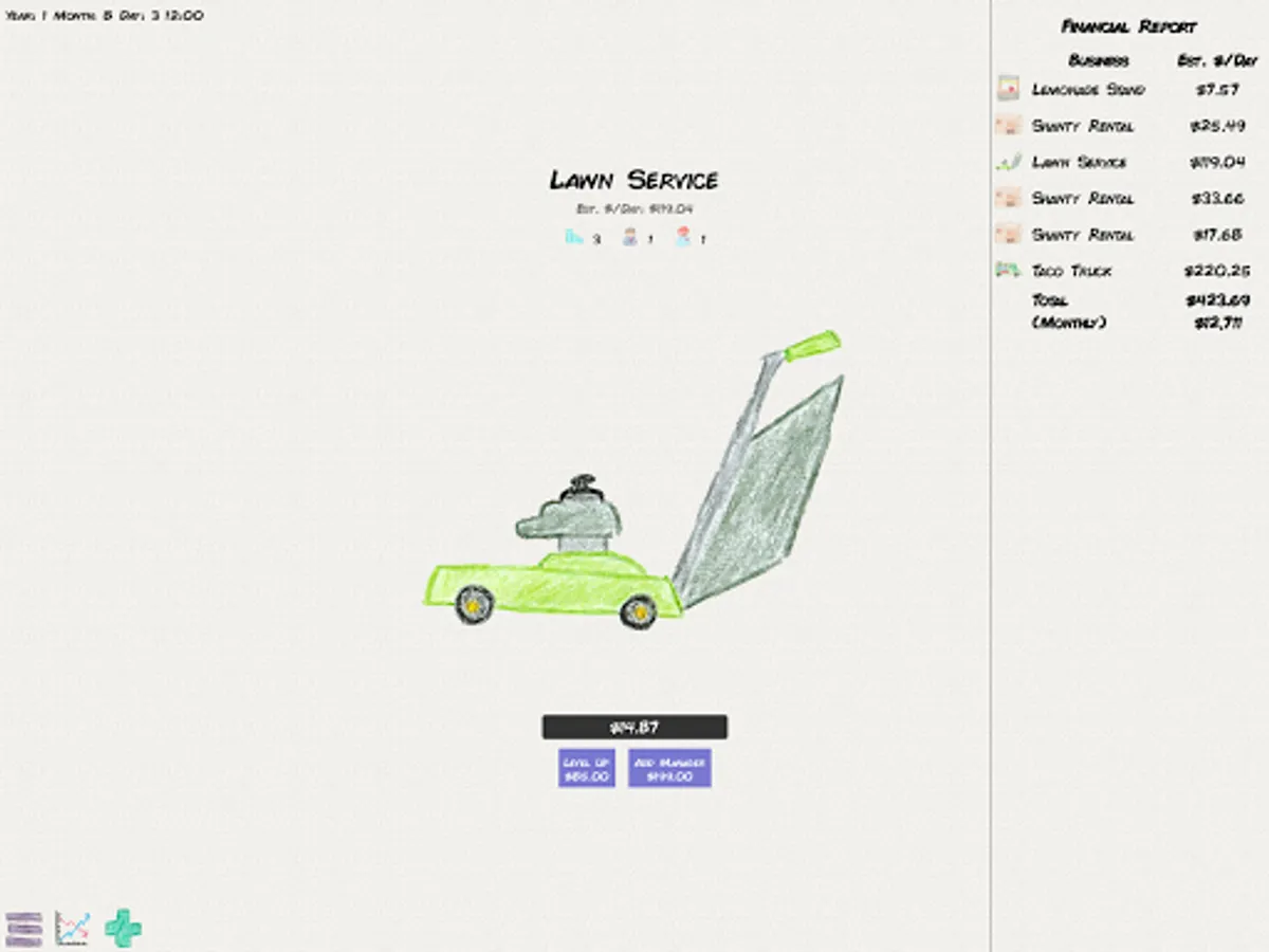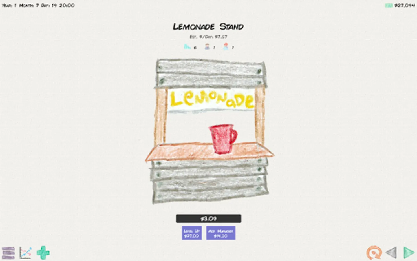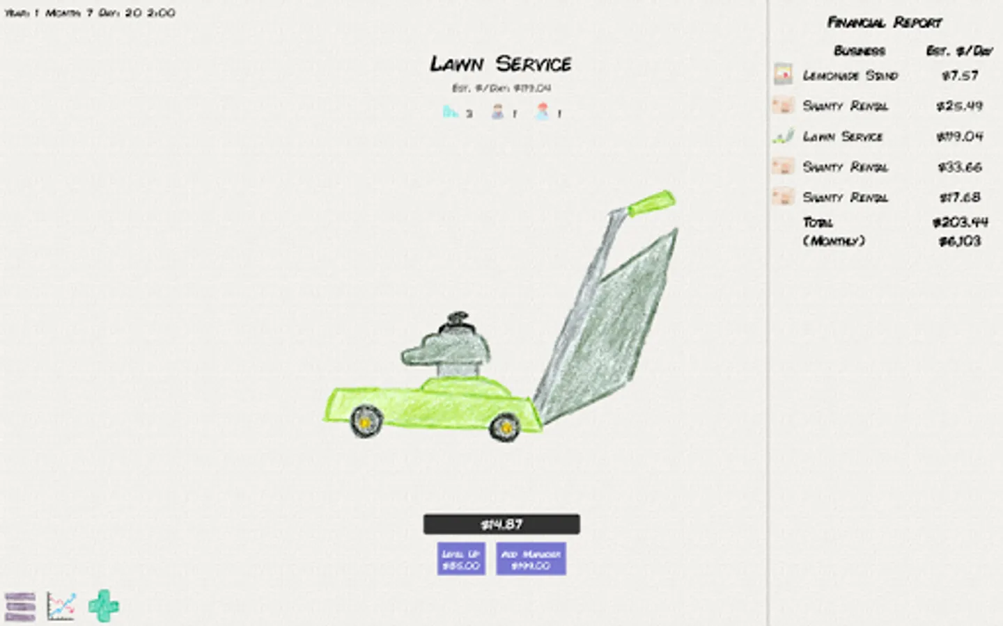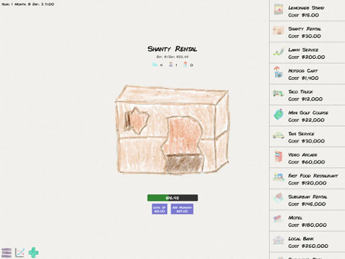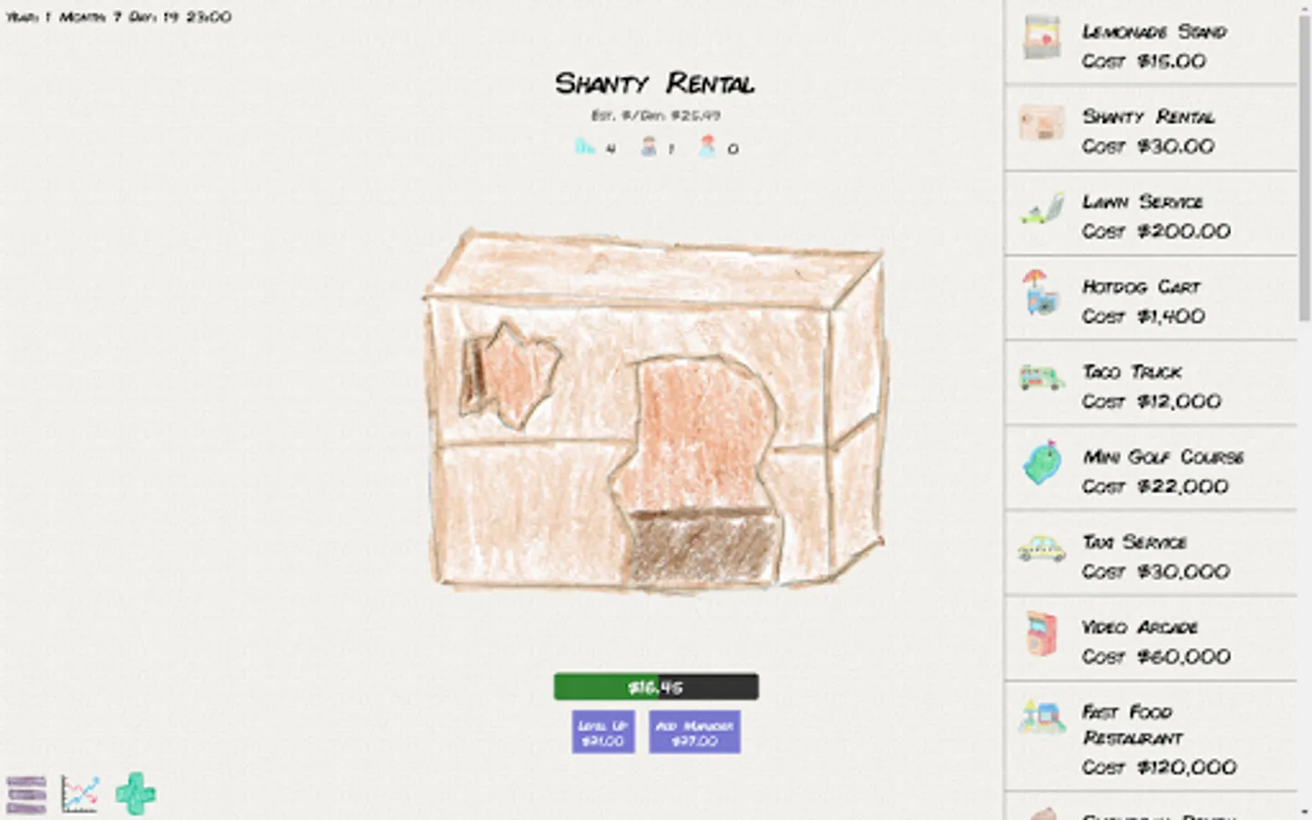 For a unique look and feel, all graphics in this business simulation tycoon style game were hand drawn with crayons.