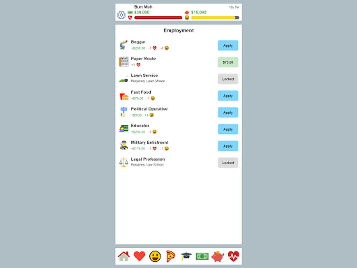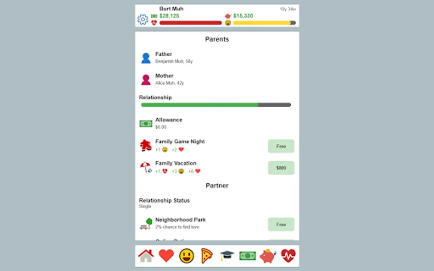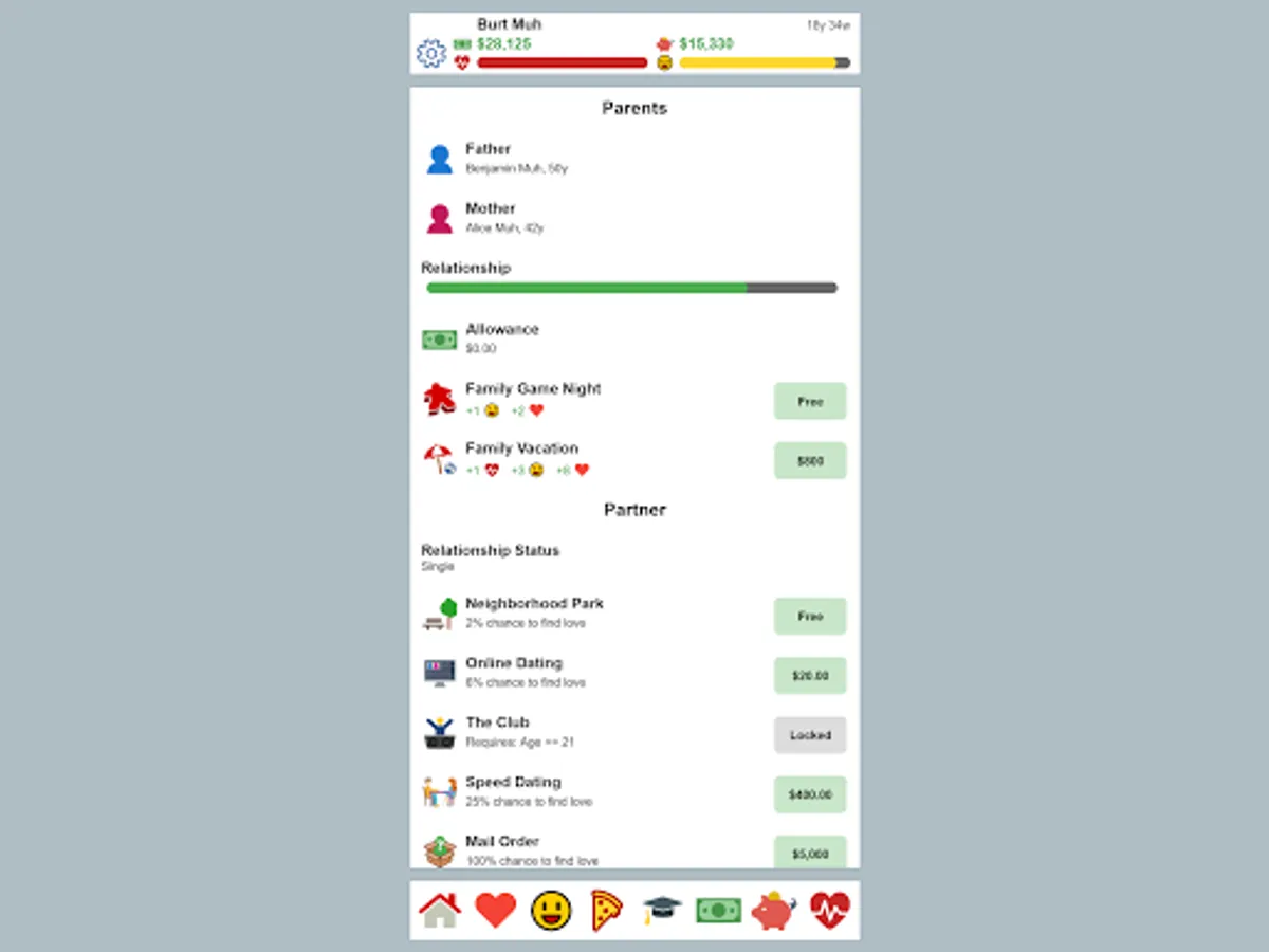 A fun life simulator game. In My Life, you begin as a child and play your way through to your death. The choices and decisions you make along the way will impact how your life plays out. Will you go to school? How much school will you go to? This will impact what kind of jobs you can work and what kind of living you will make. Will you spend time with your family? Start a family of your own? This will impact your happiness and well being. What kind of diet will you eat? Where will you live? Will you get married? How much money will you save? All if these decisions will impact how long you live and how your life turns out!