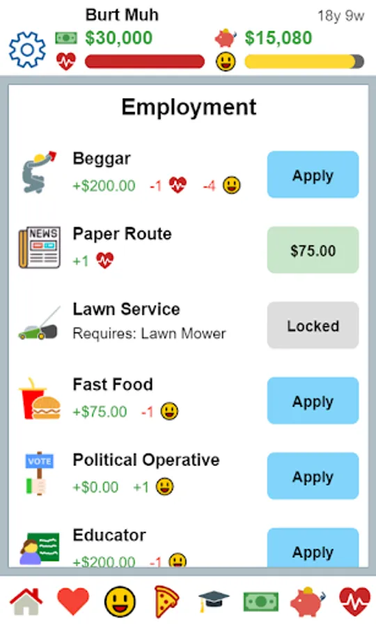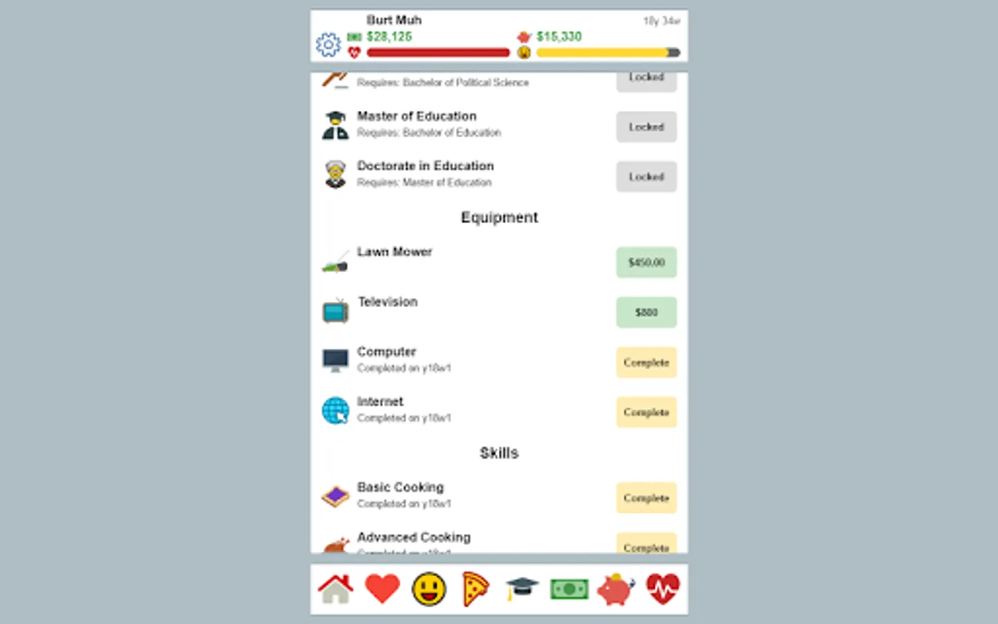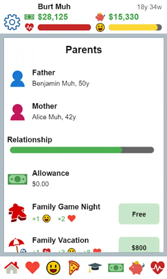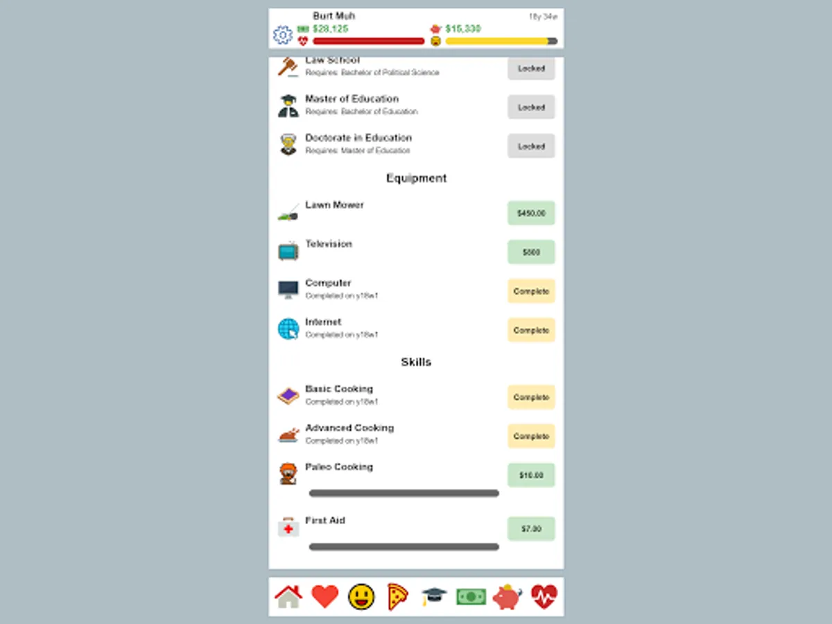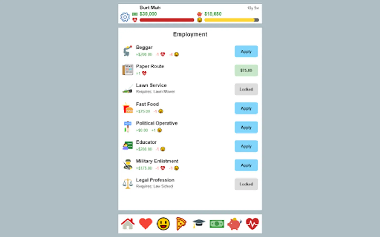 A fun life simulator game. In My Life, you begin as a child and play your way through to your death. The choices and decisions you make along the way will impact how your life plays out. Will you go to school? How much school will you go to? This will impact what kind of jobs you can work and what kind of living you will make. Will you spend time with your family? Start a family of your own? This will impact your happiness and well being. What kind of diet will you eat? Where will you live? Will you get married? How much money will you save? All if these decisions will impact how long you live and how your life turns out!
