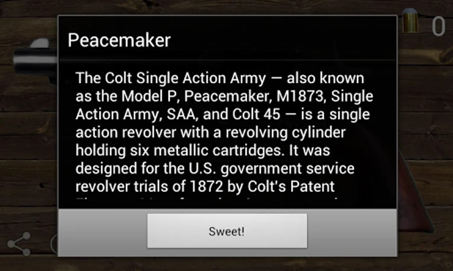 Peacemaker is a replica and informational app about the Colt Single Action Army revolver, aka the Peacemaker, the gun that won the west! Don't show up to your next quick draw without it!