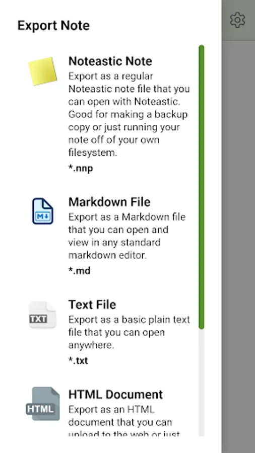 Export to .txt - The new permissions in this version of Noteastic are due to the new feature that lets you save your notes to your SD card as a plain text .txt file. Back up your notes to .txt and send them to your computer. Really handy to have if you are getting a new phone, or you typed some notes out in class and you want to save them!