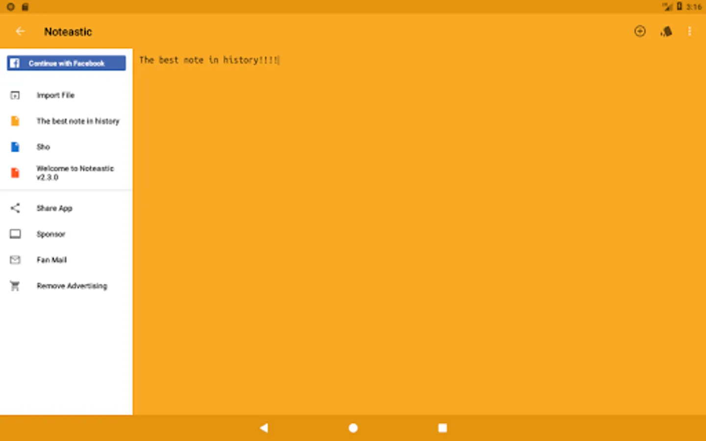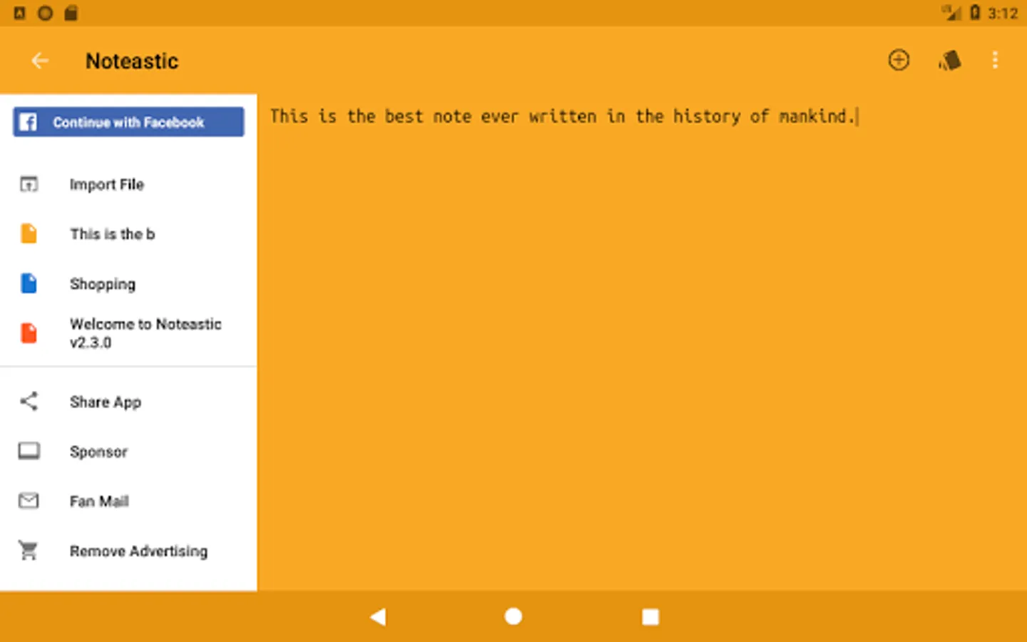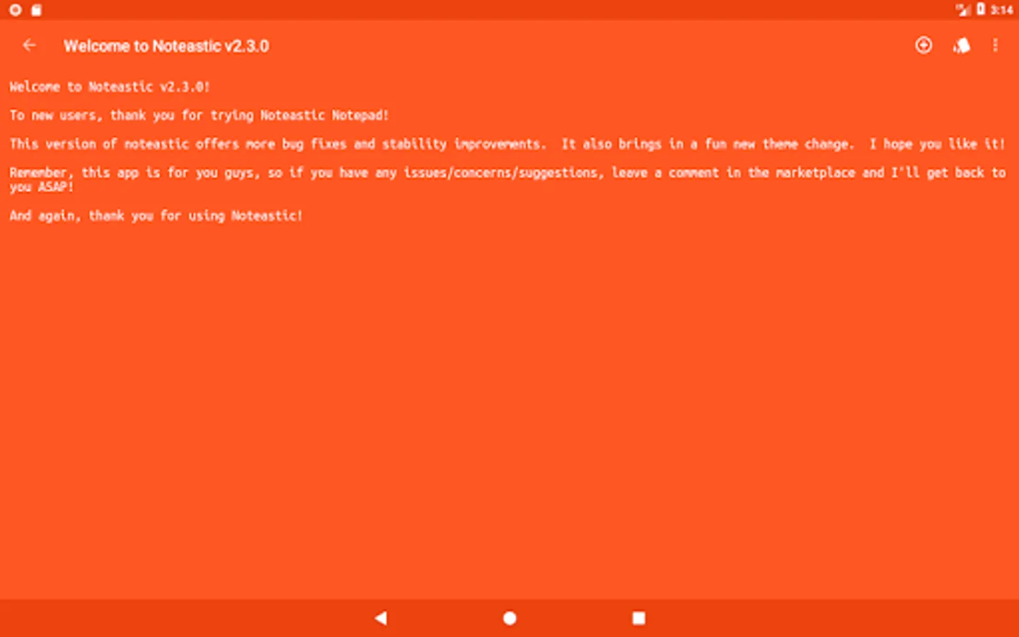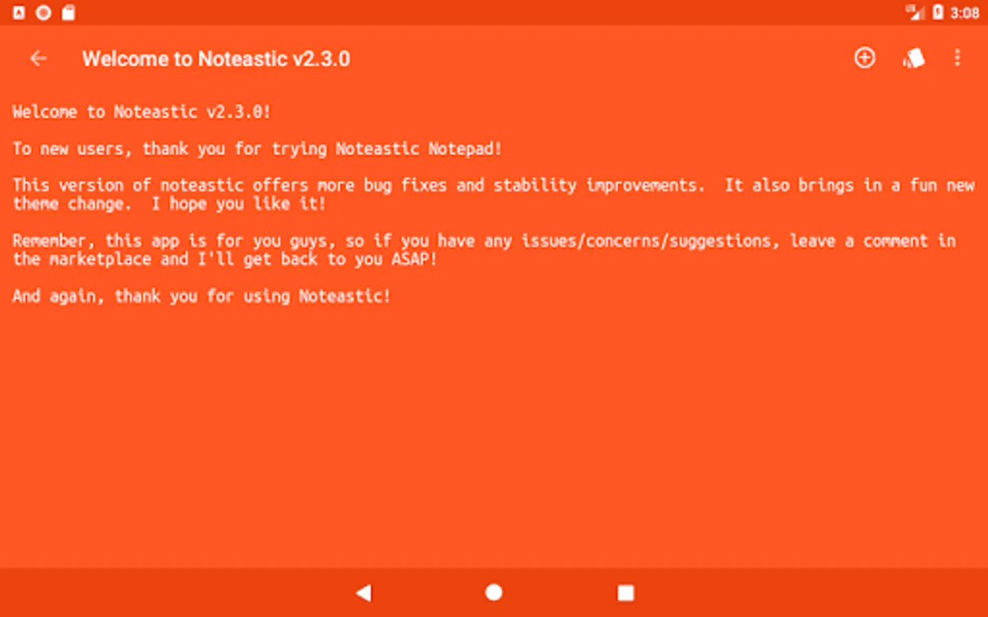 The Noteastic Notepad is a clean and free notepad app for your Android device. It was developed to work great on both tablets and smaller handsets. I will be straight up and tell you that Noteastic Notepad does not have all of the same bells and whistles as some of the leading note taking apps out there. It was designed to clean lightweight simple and easy to use. Noteastic Notepad has a virtually limitless note taking capacity and will work great on most devices. If you are not totally satisfied with Noteastic, I will refund your purchase ;-)