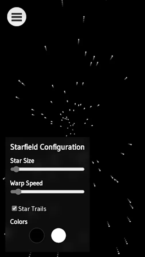 Starfield Simulator visualizes a classic starfield simulation particle effect. This star field simulator allows you to fine tune the simulation effect, giving you options to control the warp speed, star size, space color, and star color.