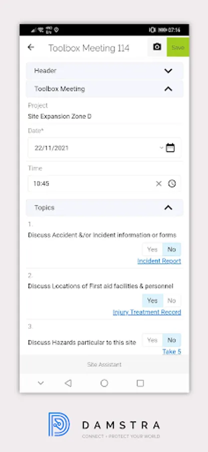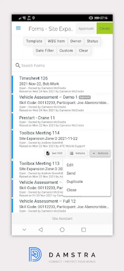 Damstra Forms saves everything into projects, organising forms and documents with sequence numbers and metadata so you can easily find them later.
