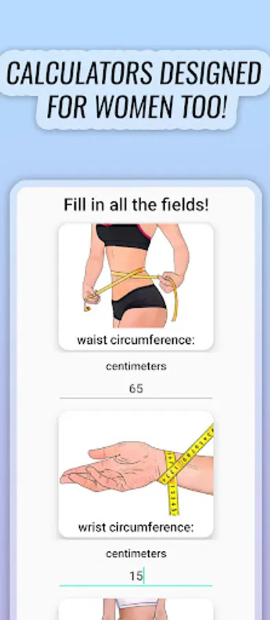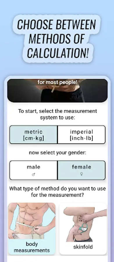 Calculate your body fat percentage using either the traditional formula with your body measurements or the skinfold caliper method. This feature provides accurate and personalized results based on your body measurements, weight, height, and skinfold thickness.