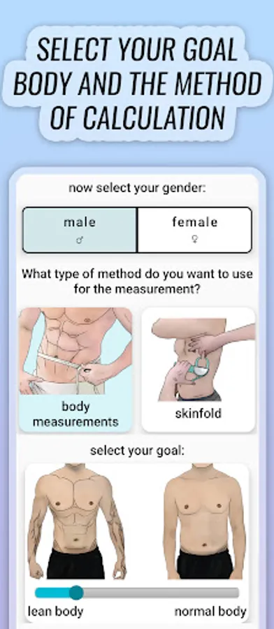 You can choose between two methods of calculation for body fat: body measurements or skinfold caliper technique, to accurately measure your body fat percentage whether if you have an skin caliper or just a measuring tape.