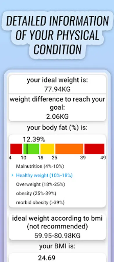 Say goodbye to generic weight calculators based solely on height and age. Ideal Weight revolutionizes the process by incorporating calculations based on body fat percent % , muscle mass (fat free mass) and BMI (Body mass index) our app ensures that your ideal weight is adapted to your unique body composition and your desired body whether if you want a more lean physique or a more normal one.