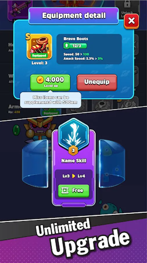 * Collect as much equipment as possible during the adventure to improve your combat skills.
