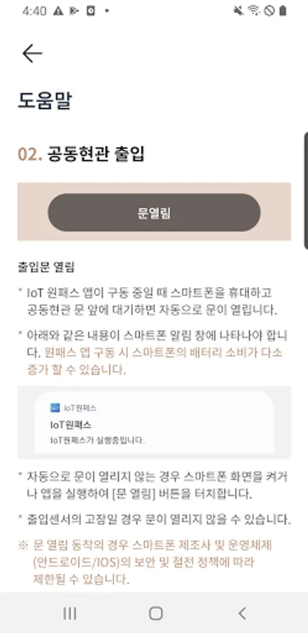 * For the smooth use of the IoT OnePass app, the app's location permission must be set to [Always allow], and the location and Bluetooth must be turned on at all times.