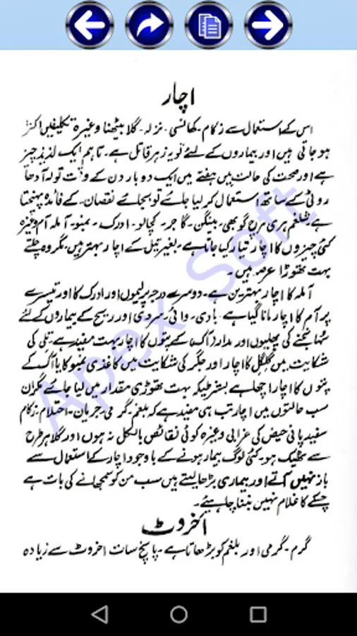 Is Application kay zyada hissa main Khanay Peenay Ki taqreeban tamam cheezon ka zikar hai jo kay ham aam taur per istimaal kertay hain. Anaaj, Sabziyan, Phal, Maivay, Gosht, Paani, Mitti, Doodh, Ghee, masalay, radeef waar alif say lay ker yay tak jitnay hain. In sab ki taseer day dee gaye hai. konsi cheez kis tabeat kay logon kay liye mufeed hai aur kin ko nahin. Kin Khaas beemariyon main konsi ghezaa istimaal hoti hai aur kin main nahin. Iss application main in detail sab ghizaaon say ilaj kay baaray main btaya gya hain.