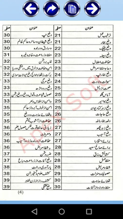 Baraiye sheerini e Phal, Dafa Ghussa Hakam, Talaashe Gum shuda, Baraaye Mohabbat e Zauj, Dafa Asar Shaitaan, Hifazat az chori, adaaye qarz, pisr saaleh, taskheer sawaari, faraakhi e rizq, Nijjat az museebat, Istajabat dua, shifa az marz, Raihaai az giriftari e zalim, nuskha hubb, bukhaar az garmi, dafa hol dil, nuskha e mohabbat, taraqqi e tijarat, shifa az sehar, az bukhaar sardi, istaqamat e qalb, baraaye aulaad, hifz e hamal, hifz e wasawas, istaqraar e hamal...etc