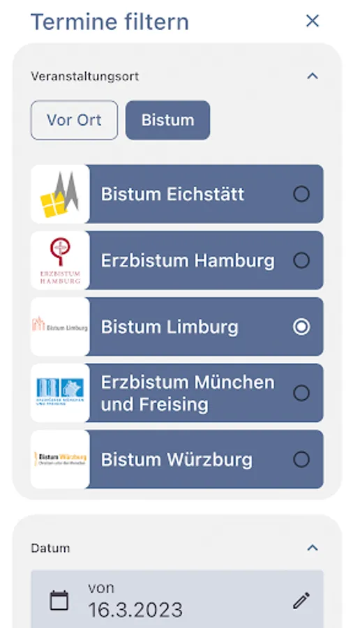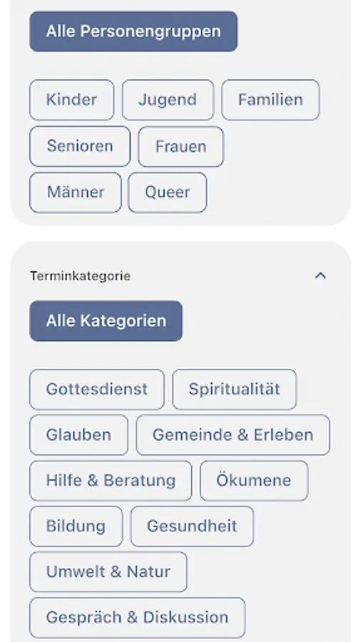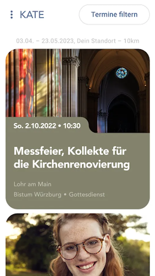 Whether it’s a concert, collection of clothes, coffee group or toddler group, whether it’s a yoga class, church service, Bible meeting or online seminar, whether at your home town or where you are right now: KATE sorts thousands of Catholic appointments for you every day and finds offers that interest you – from parishes, dioceses, further education institutions, academies and associations.