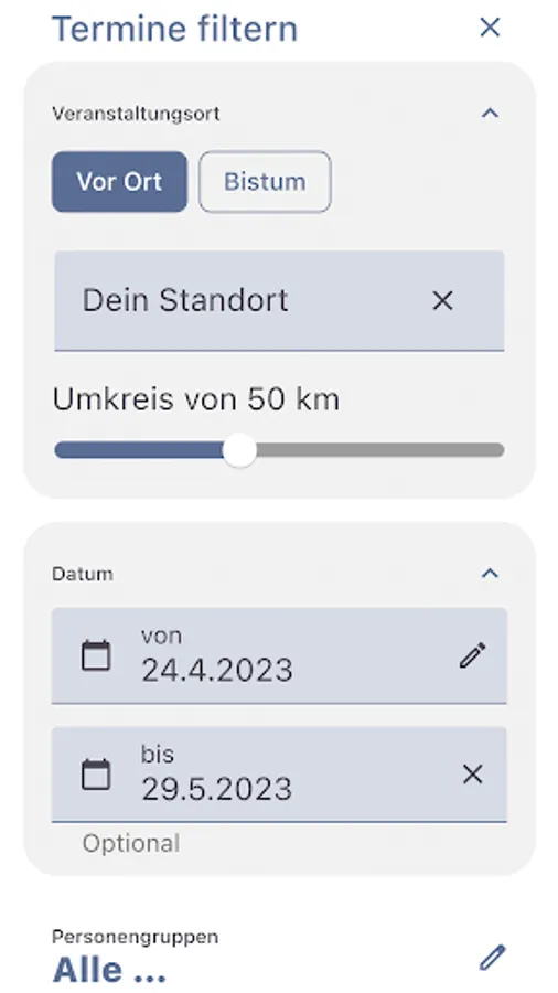 KATE offers you various filter options. In the app you can enter your desired location manually, or you can search for all appointments based on your current location. You decide when you want to participate. You can search by location and by type of event. You can choose a date or a period. You can choose according to groups of people or according to date categories and also combine both. Up to five appointment categories can be selected at the same time. When you have set all your filters, you will get your corresponding appointments in chronological order.
