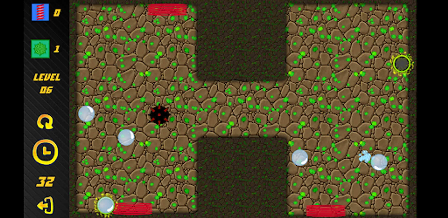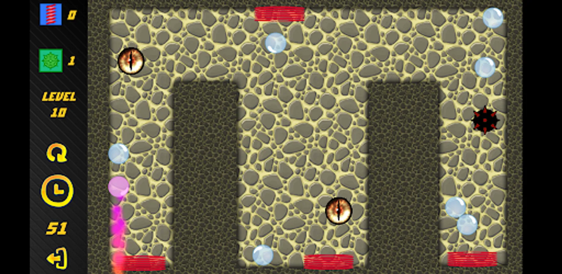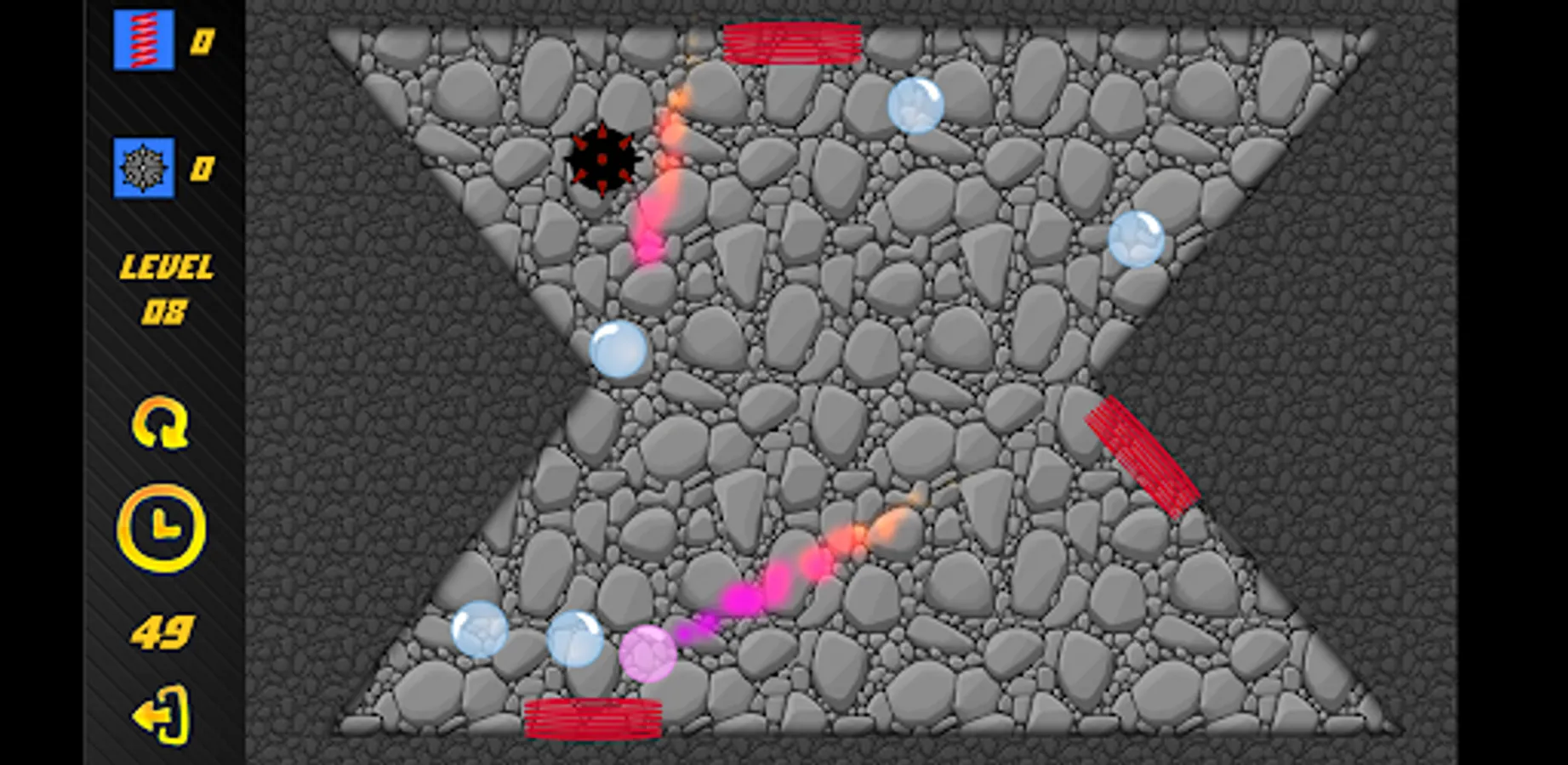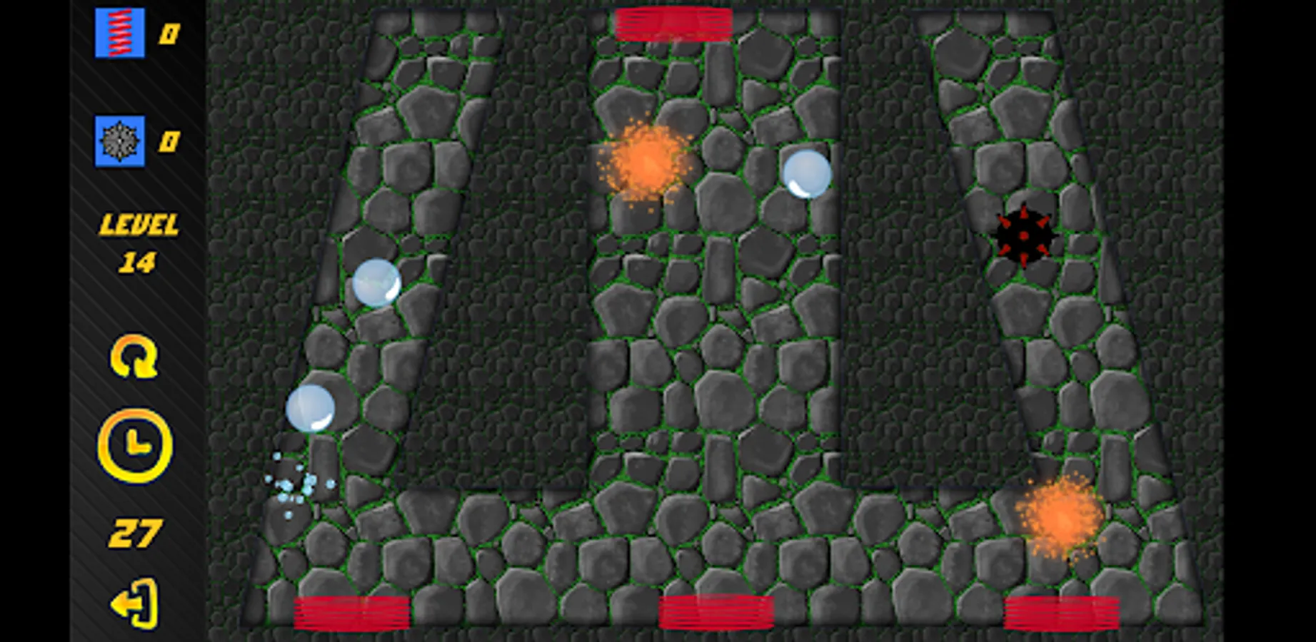 The goal of the game is to destroy all the bubbles using the specified tools: springs and mines. Complete different levels with different geometry. Unlock new locations. Complicating elements await you in new locations.