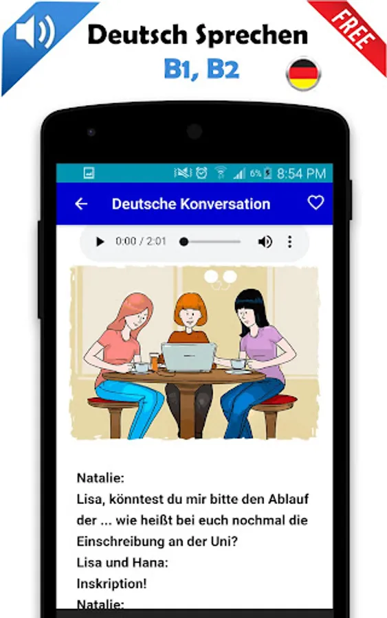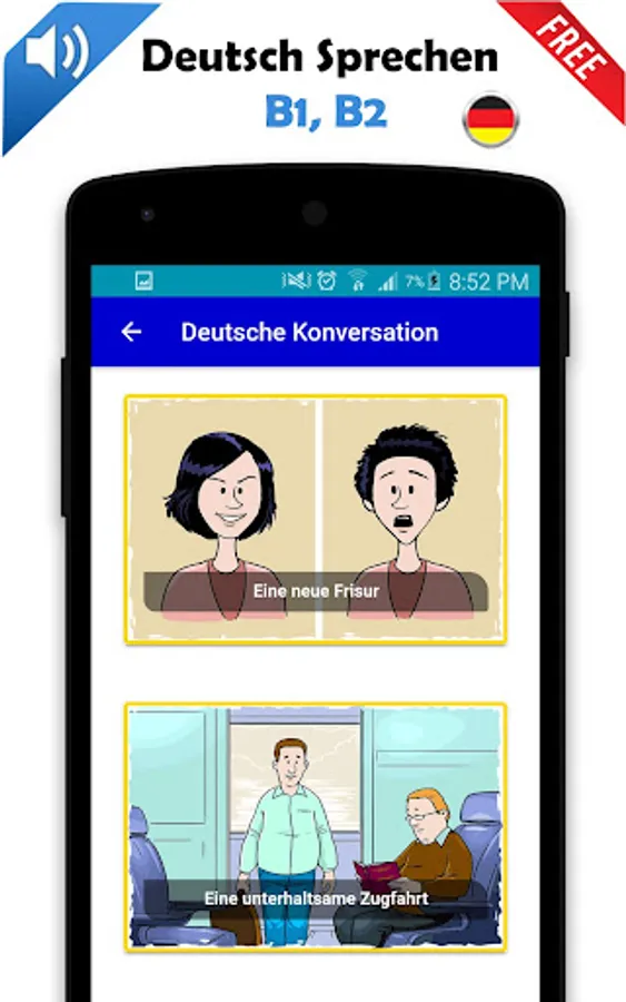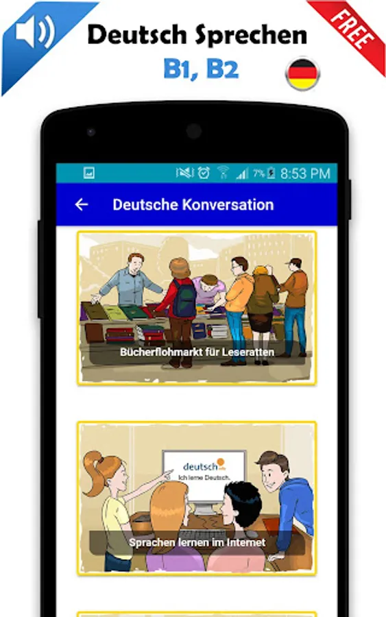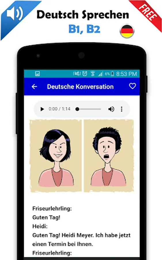 The application of the German language with sound includes the pronunciation of the foreign pronunciation and is supplemented by the English translation this application of the German language shows a number of the most important and well-known everyday situations and life.