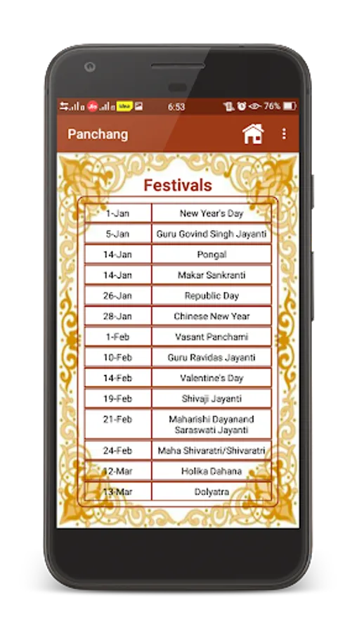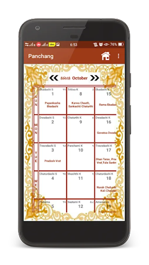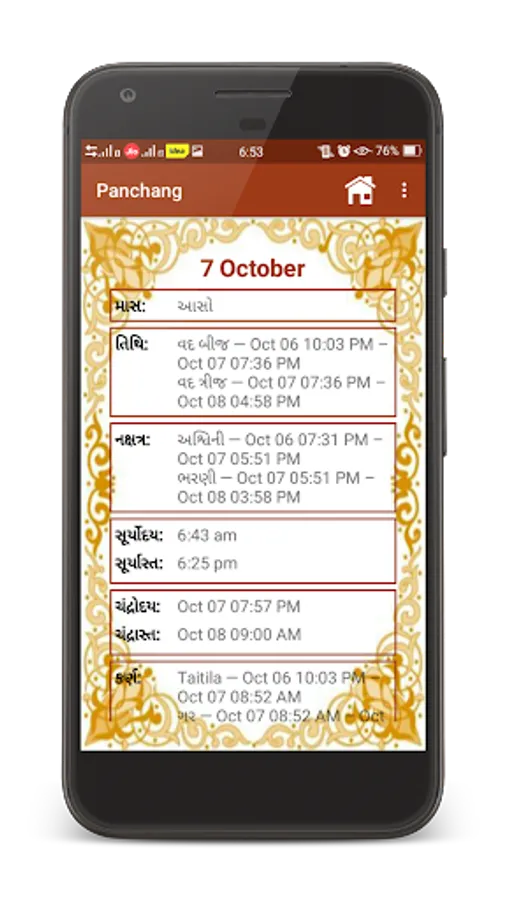 This Gujarati Panchang Calendar app brings you daily panchangam in Gujarati language, holidays list, Gujarati festivals, puja, cultural celebrations, etc. This Panchang application is a great tool and must to use app for productivity of your day with different types of information and tools.