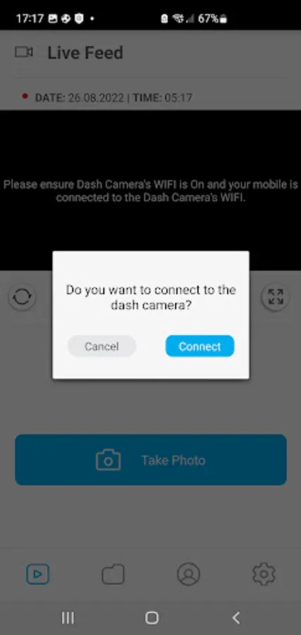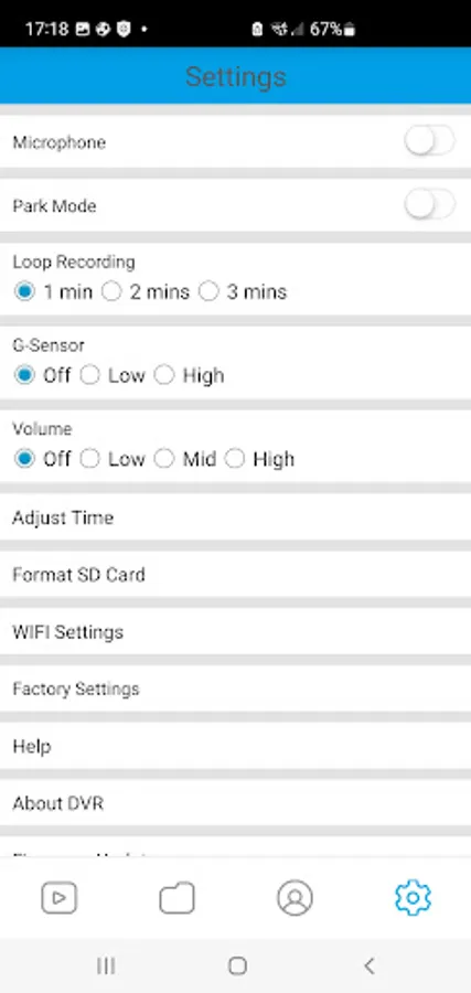 Once connected you can access all the videos recorded by your dashcam stored on the micro SD Card which you can play back on your smartphone . There is also a Live View mode to check the alignment of the dashcam and the dashcam settings are controlled via the settings menu in the app.