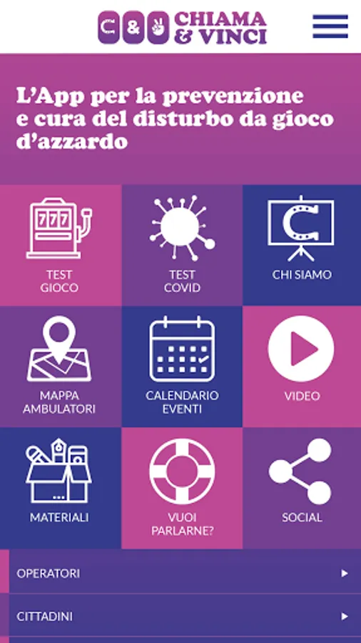 The Chiama & Vinci App is a project that is part of the Business Plan of activities for the fight against gambling of the Ulss 3 Serenissima Company promoted by the Veneto Region with the Regional Law 38/2019. The App aims to promote interventions aimed at the prevention, contrast and reduction of gambling risks and related problems, as well as the treatment and recovery of people who are dependent on them and the support of their families. .