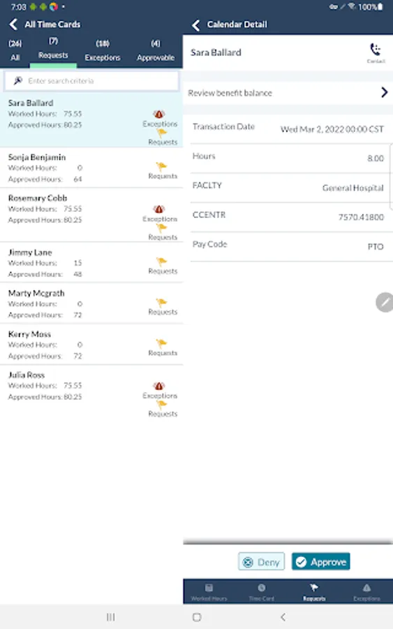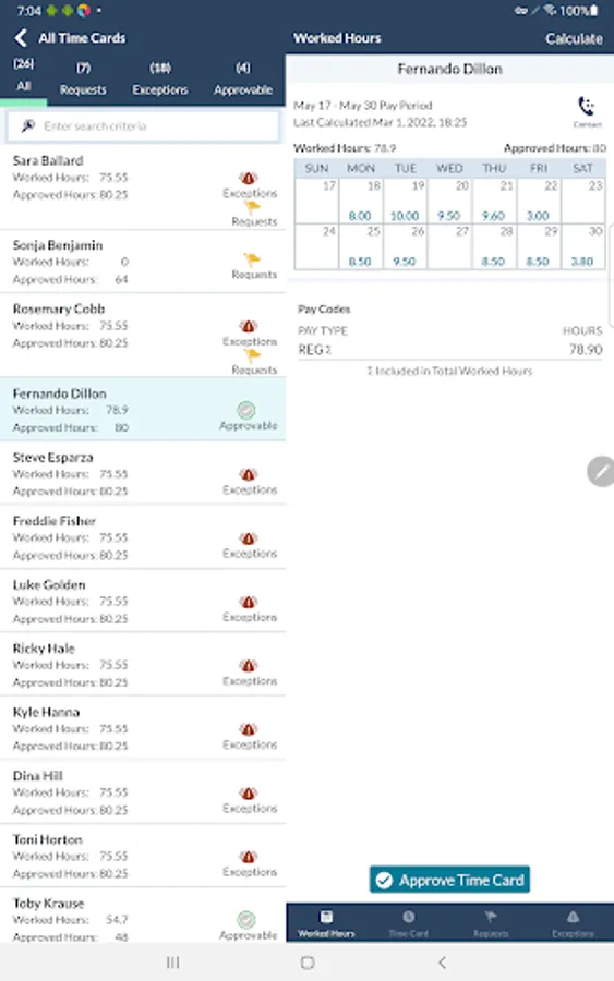 • View your employees' timecards, requests, exceptions, and contact information.