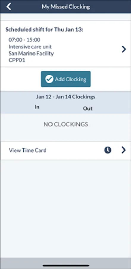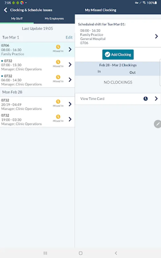 • View missed clocking alerts, clock in/out, sign off your timecard and add/edit/delete clockings and calendars.