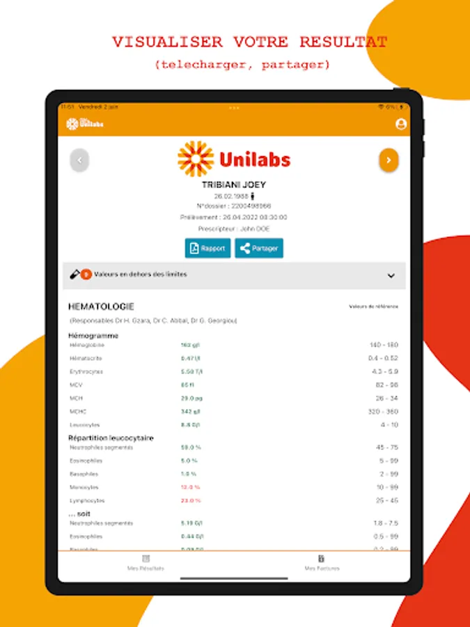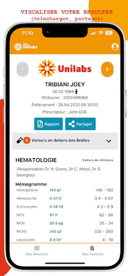 MyUnilabs also allows you to view your reports in PDF form, in your language, and to share your results securely with someone you trust (for example with a specialist doctor). In order to benefit from access to MyUnilabs, all you have to do is ask your doctor to have your results sent to you in electronic copy.