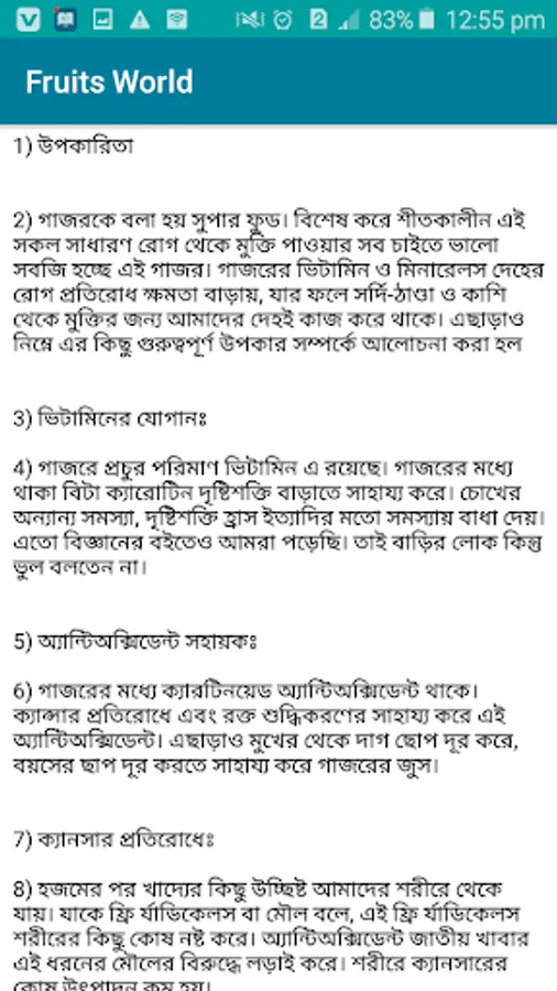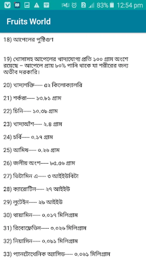 Fruits world, হচ্ছে বিভিন্ন ফলের পুষ্টি উপাদান সম্পর্কিত একটি অ্যাপ্লিকেশন । যার মাধ্যমে আপনি বিভিন্ন দেশি বিদেশি ফলের পরিচয় এবং পুষ্টিগুণ সম্পর্কে জানতে পারবেন ।এছাড়াও আপনি কোন ফল থেকে কি পরিমানে ভিটামিন ও খনিজ লবণ পাওয়া যায় তার বিস্তারিত এই অ্যাপ টিতে আছে ।