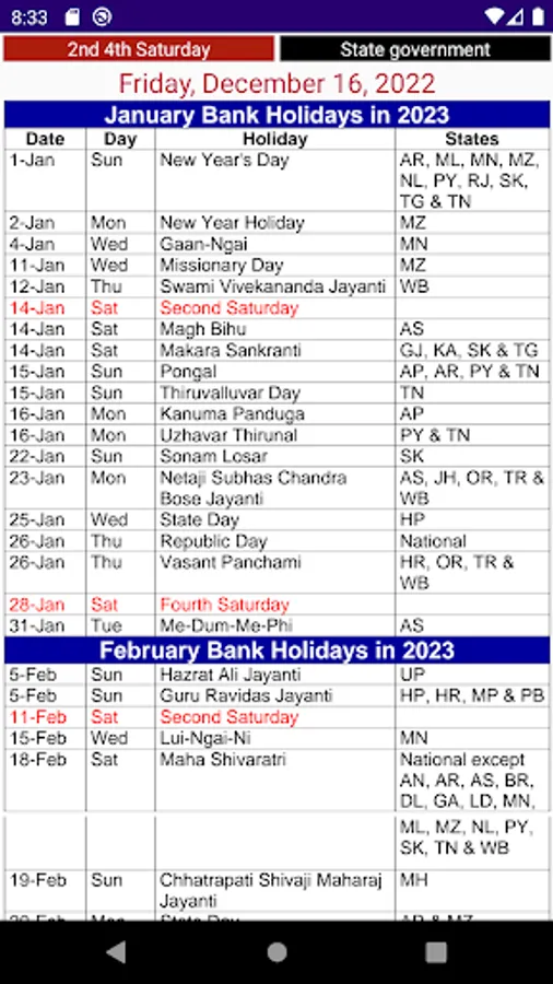 This app enables you to find the holidays per Indian state of the following banks for the year 2023: