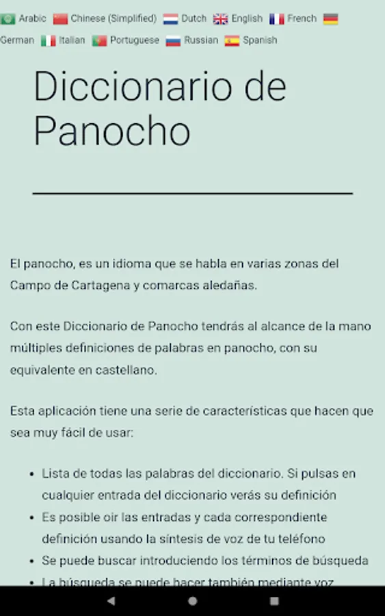 With this Panocho Dictionary you will have at your fingertips multiple definitions of words in Panocho, with its equivalent in Spanish.