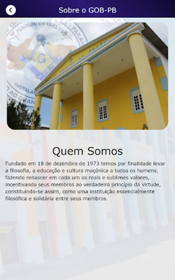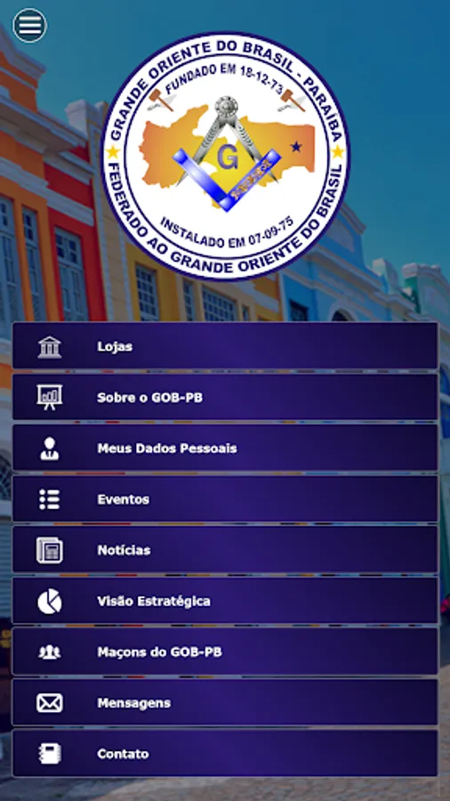 Through the menu "About the GOB-PB", you can access information about the values and purposes of the Grande Oriente de Brasil - Paraíba.