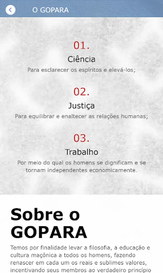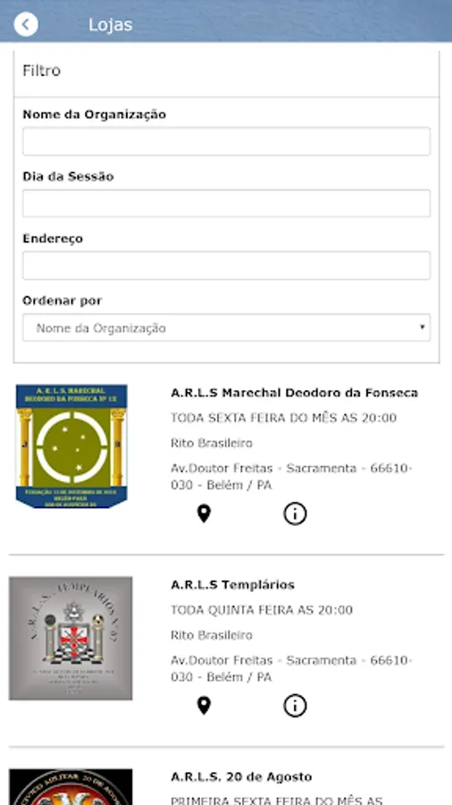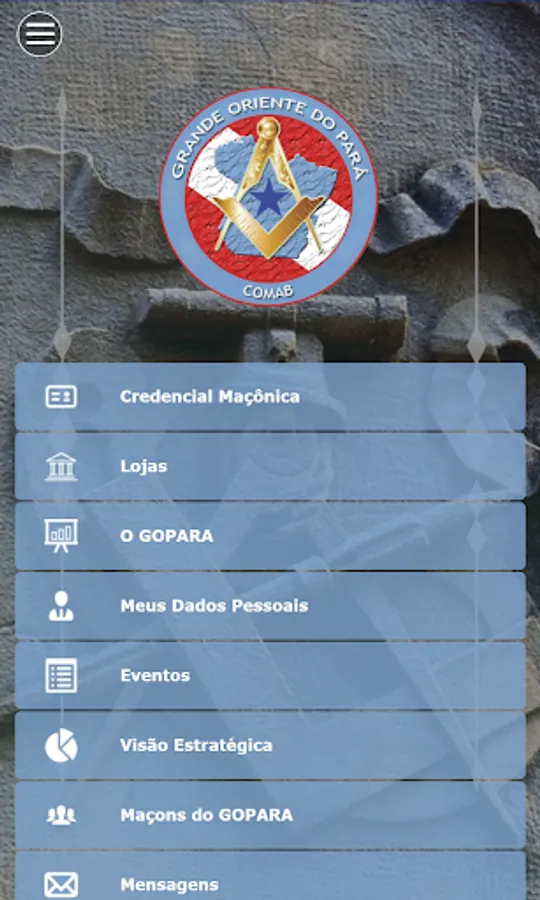 Have access to information about the Organizations and Members that are part of GOPARÁ, through the respective menus "Lojas" and "Maçons do GOPARÁ". Have access to your own personal data through the menu “My Personal Data”. You can view the events through the "Events" menu and the means of contact that GOPARÁ has through the "Contact" menu.