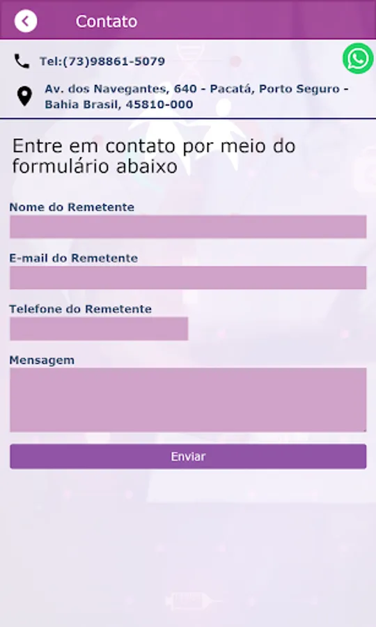 7) In the “Contact” menu, the user will have access to the contact information of the AMIGO Saúde Program, such as address, telephone, WhatsApp and a contact form.
