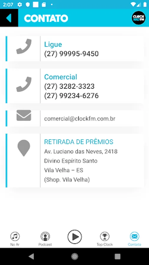 Clock FM has one of the largest covers of the Holy Spirit. With a single signal, at a frequency of 105.7 MHz, it reaches a population of over 2,400,000 and covers the municipalities of Vitória, Vila Velha, Serra, Cariacica, Viana, Guarapari, Anchieta, Domingos Martins, Marshal Floriano, Santa Maria de Jetibá. , Santa Leopoldina, Santa Teresa, Alfredo Chaves, Fundão, Ibiraçu, Aracruz, João Neiva and Linhares. Over the internet, coverage is borderless.