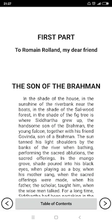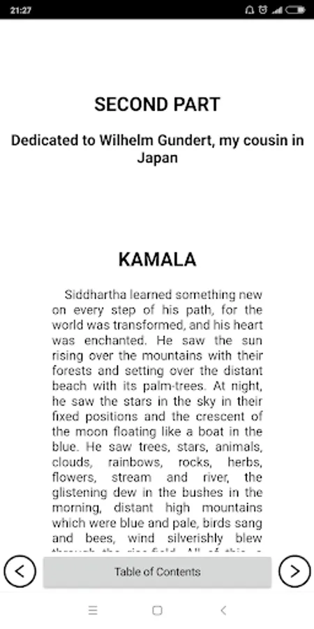 Siddhartha is a novel by Hermann Hesse that deals with the spiritual journey of self-discovery of a man named Siddhartha during the time of the Gautama Buddha. The book, Hesse's ninth novel, was written in German, in a simple, lyrical style. It was published in the U.S. in 1951 and became influential during the 1960s. Hesse dedicated the first part of it to Romain Rolland and the second part to Wilhelm Gundert, his cousin.
