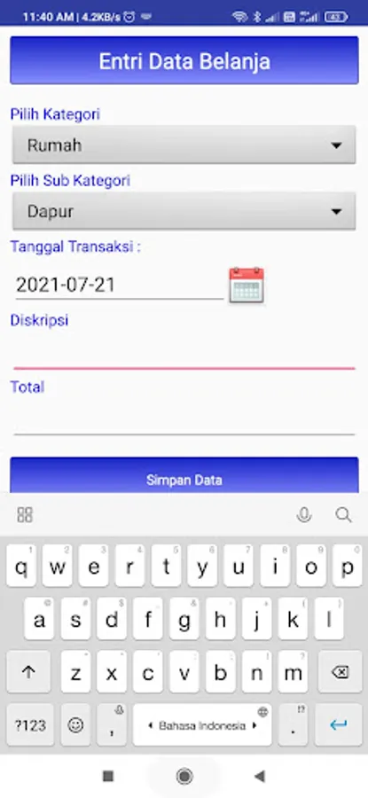 used for shopping data entry, users can select categories, sub categories, select dates, descriptions and total shopping.
