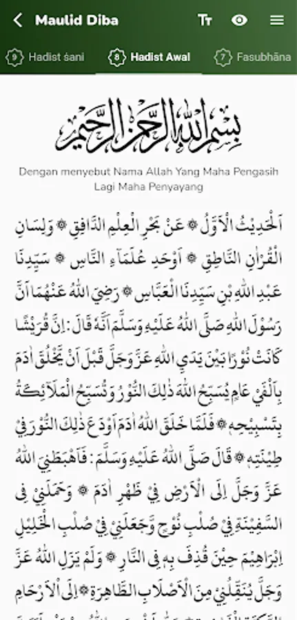In the Arabic-Indonesian Maulid Diba application, you will find the original text which can be read very clearly. These aren't scanned images, so you can soak in every word easily, without distractions.