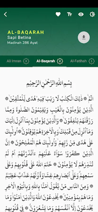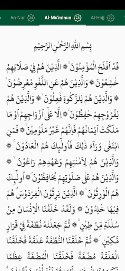 This mode gives you an experience like reading a copy of the Koran, where the Arabic text is connected like in a physical copy, creating fluency in your reading.