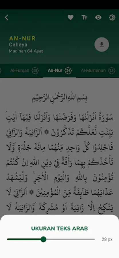 In "Al Quran Mushaf Indonesia," you have complete control over the appearance of the Al-Quran text. You can choose between two different display modes to suit your preferences: